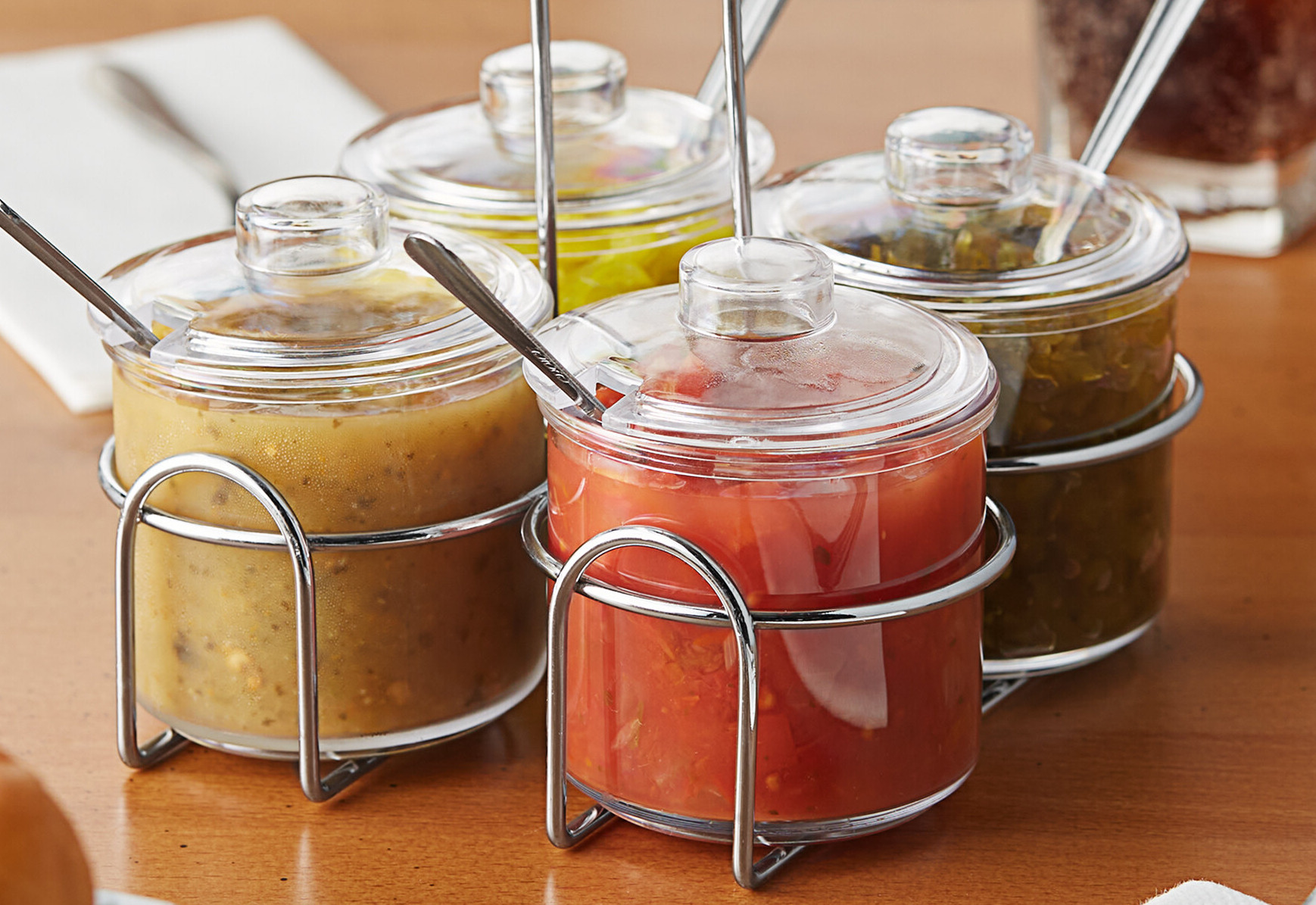 Thanks to the simplistic design and included lid, these condiment jars are perfect for a variety of uses and applications. The matching lids help keep contaminants out of the jars to protect the contents while the open notch allows you to place a spoon with the jars for added convenience.