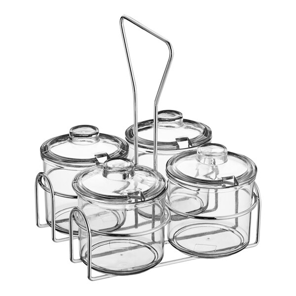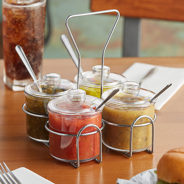 Provide your patrons easy access to the condiments they love with this Choice 4-compartment wire condiment caddy with (4) 7 oz. clear plastic jars with lids!
