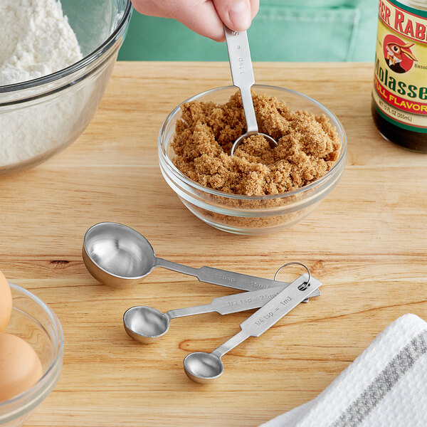 These heavy-duty stainless steel measuring spoons are constructed to withstand the rigors of your commercial kitchen. They are held together by a small ring, making them easy to organize and store.