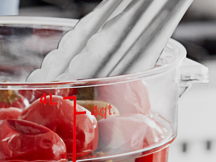 Bold red graduations are printed on the side of the container for easy, immediate measuring. For complete clarity, the measurements are printed in both quarts and liters. You can also easily identify and track the date your food product was made using the reusable "date" indicator at the bottom of the container or simply adhere a label to the side of your container.