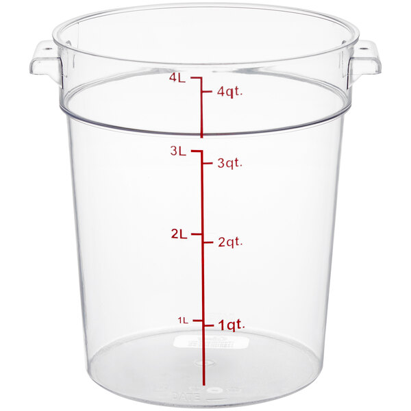 This food storage container is perfect for restaurants, caterers, delis, and cafes. The textured bottom provides durability against scratches and doubles as a non-skid surface, meaning your container won't easily slide around. When paired with a compatible lid (sold separately), it keeps food fresher for longer than when covered with traditional foil or plastic wrap. Use this 4 qt. container to store any ingredient or prepped food in your commercial kitchen.