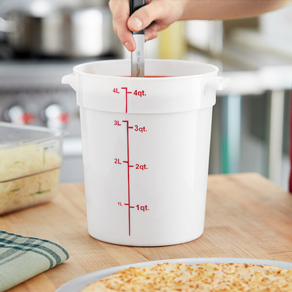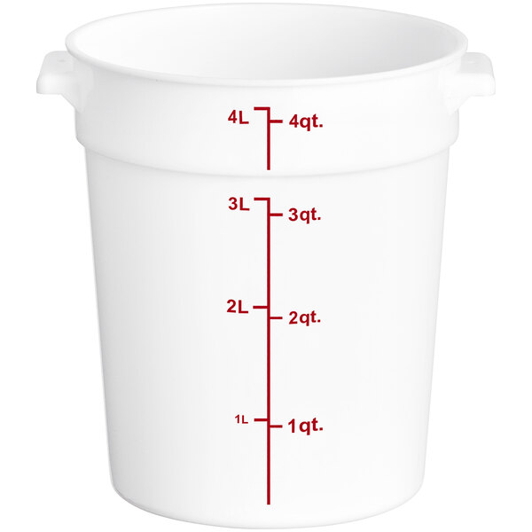 This 22 qt container is perfect for storing ingredients. Its round design and red gradations make measuring easy. Durable and easy to clean.