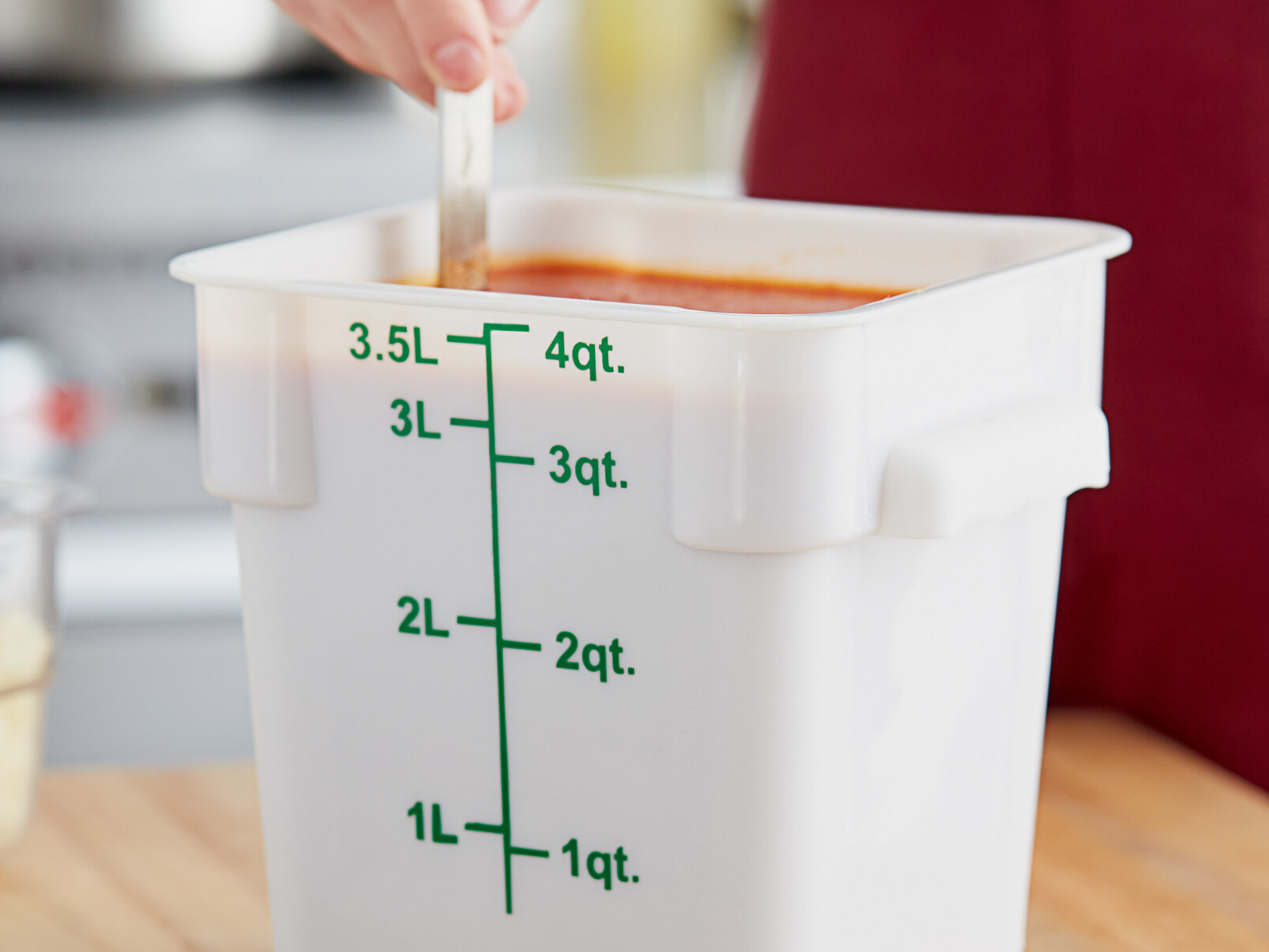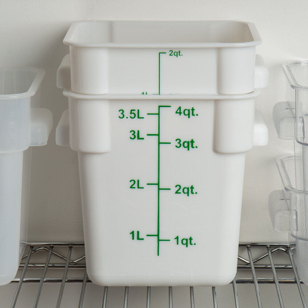 The white design of this food storage container allows for a clean look. Bold green graduations are printed on the side of the container in both quarts and liters for easy, immediate measuring, saving you time and effort during food preparation.