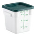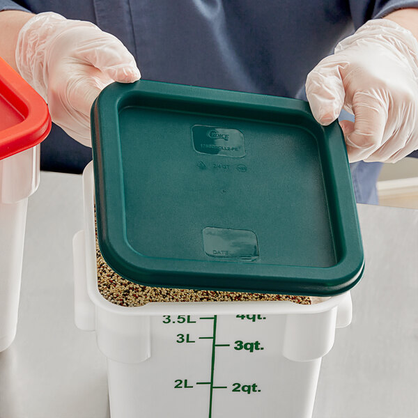 Whether storing dry goods or prepped ingredients, this container is versatile and can handle temperatures ranging from -40 to 160 degrees Fahrenheit, making it ideal for a wide range of kitchen tasks. This Choice white square polypropylene food storage container with green lid is perfect for restaurants, catering establishments, delis, and cafes that want to enhance their service and streamline their prep organization!
