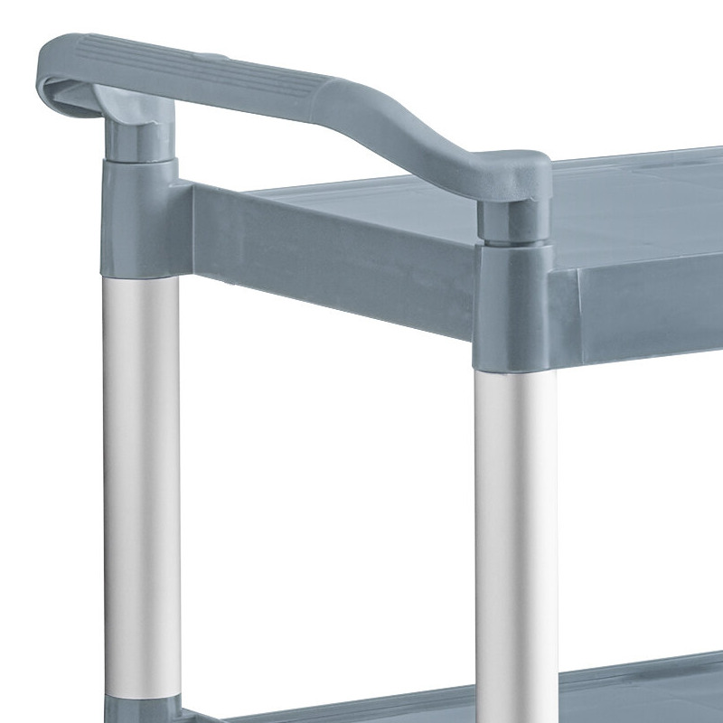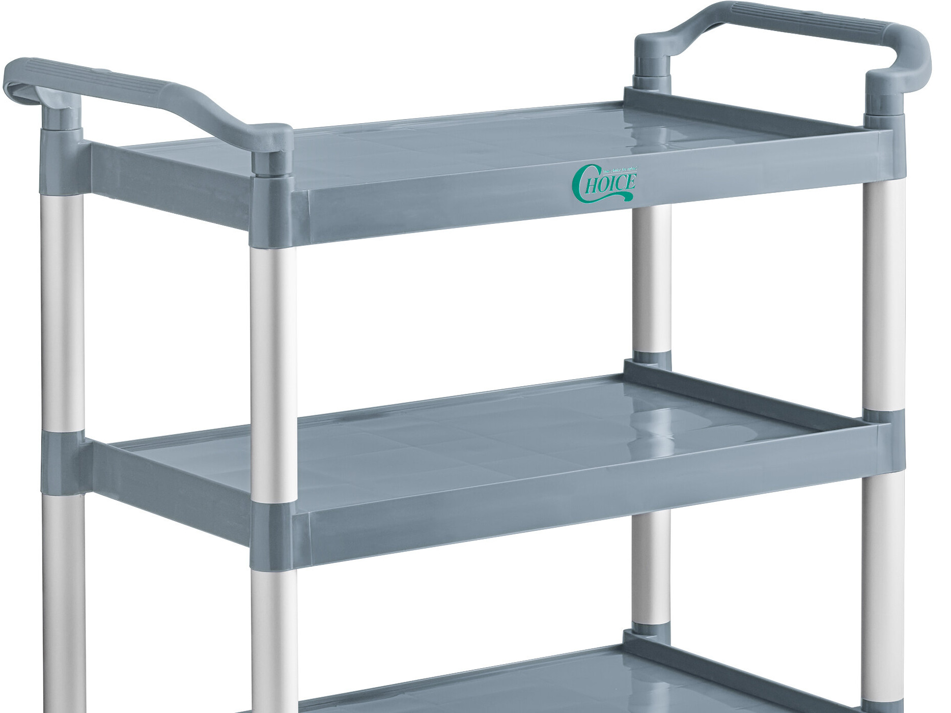Perfect for restaurants, hotels, janitorial staff, caterers, and more, this Choice gray utility / bussing cart with three shelves is a reliable way to transport a wide array of items.