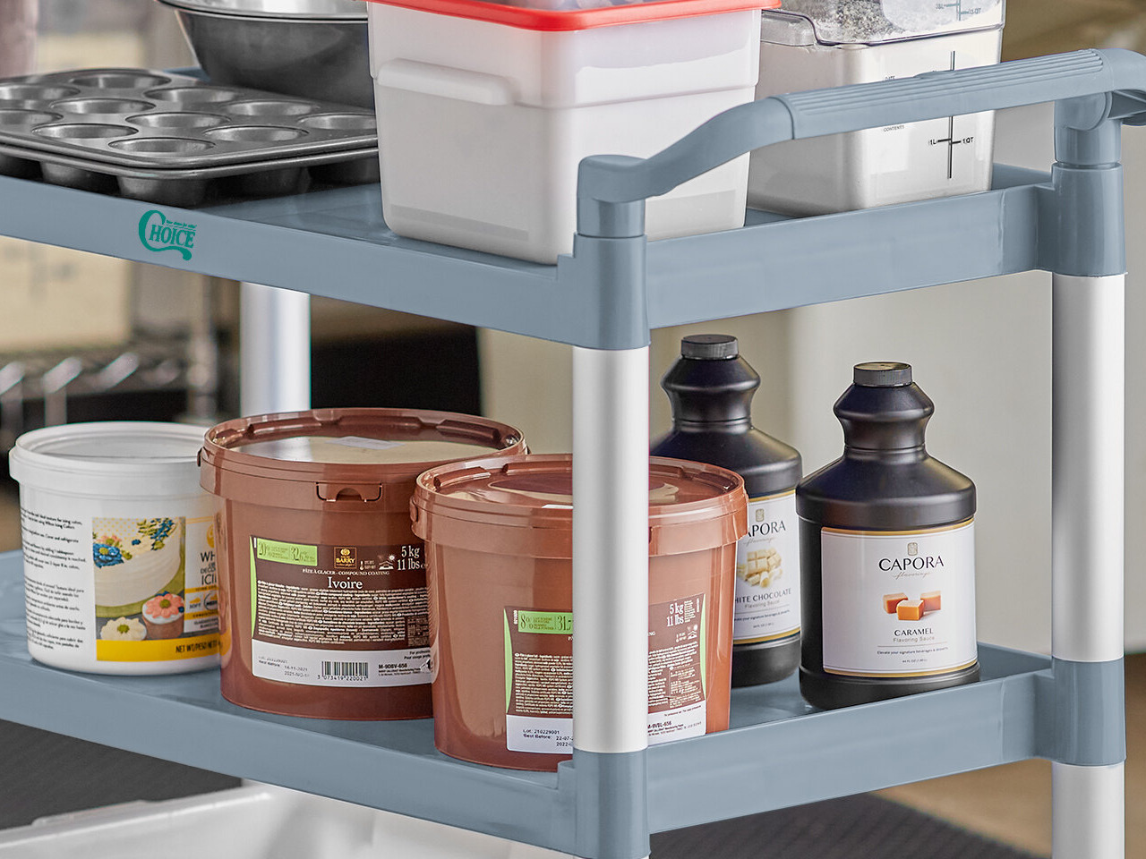 Whether you are bussing tables in a crowded restaurant or transporting supplies at a motel, this cart's three durable plastic shelves can hold a wide array of items and a 13" clearance between each shelf allows for optimal storage. These 31" x 19" shelves are ideal for storing canned goods in the kitchen and also for transporting full bus tubs between the front of house and the back of house.
