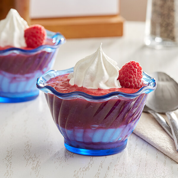 The wavy, tulip bowl design creates a unique look that will catch your customers' eyes, while the fun blue color provides a striking appearance. This dish has a 5 oz. capacity, making it ideal for pre-portioning single serve sweet or savory items.
