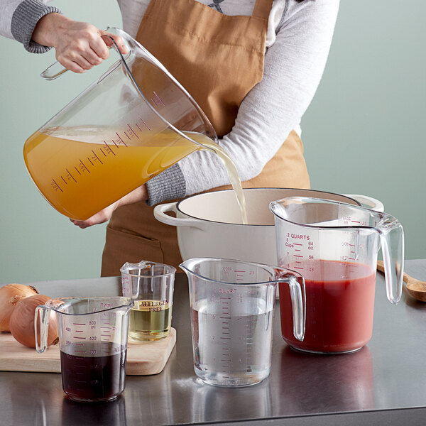 These measuring cups are dependable and lightweight for everyday use and are perfect for measuring liquid ounces or milliliters up to 4 qt., 2 qt., 1 qt., 1 pint, and 1 cup. Use them for water, oil, milk, and other liquid ingredients in your kitchen. Measurement graduations are embossed on these clear measuring cups, and the Metric and Imperial units are labeled on opposite sides for easy identification and universal use.