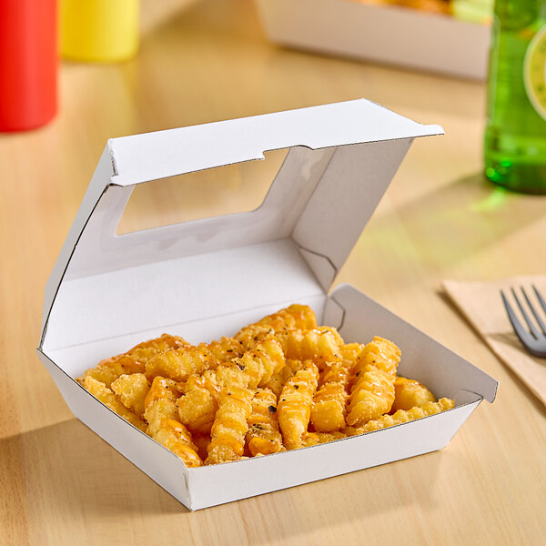 It's great for taking different types of hot and cold foods to go, including salads, sandwiches, burgers, and fries. This white container is a must-have for any restaurant, cafe, or concession stand that offers to-go options!