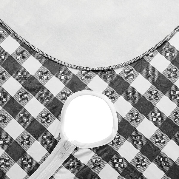This black textured gingham cover features an umbrella opening with a zipper design for easy setup and removal on outdoor tables. The zipper allows your staff to set up and remove the cover from the table without removing the table's umbrella for the ultimate convenience.