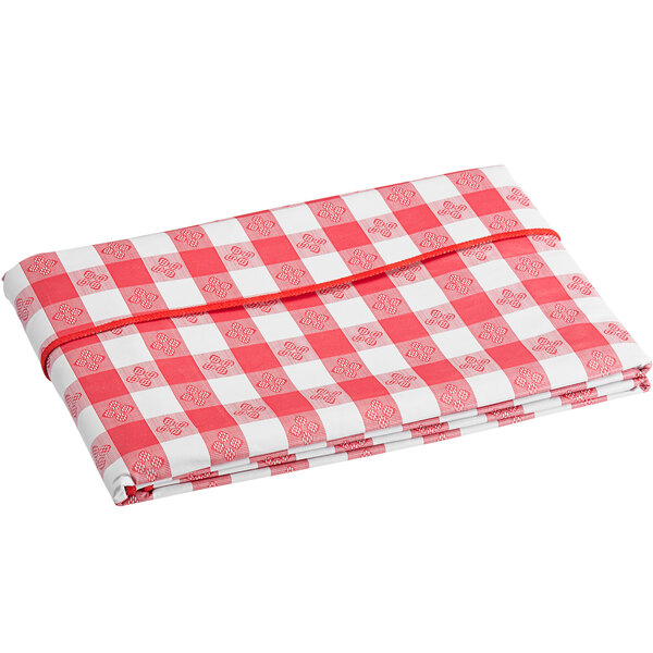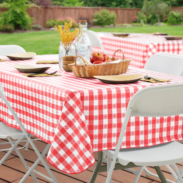 Perfect for outdoor decks, casual catered events, or classic diners, this Choice red gingham vinyl table cover with flannel back provides a classic look for any event.