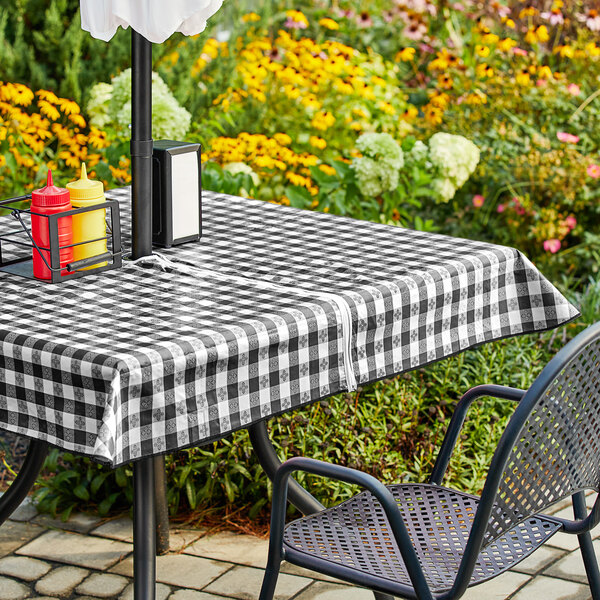 Perfect for outdoor decks, poolside cabanas, or casual catered events, this Choice black textured gingham vinyl table cover provides a classic look for any event!