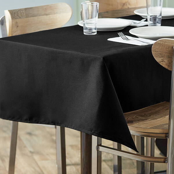 Enhance your dining experience with the Choice rectangular black seamless 100% spun polyester hemmed cloth table cover.