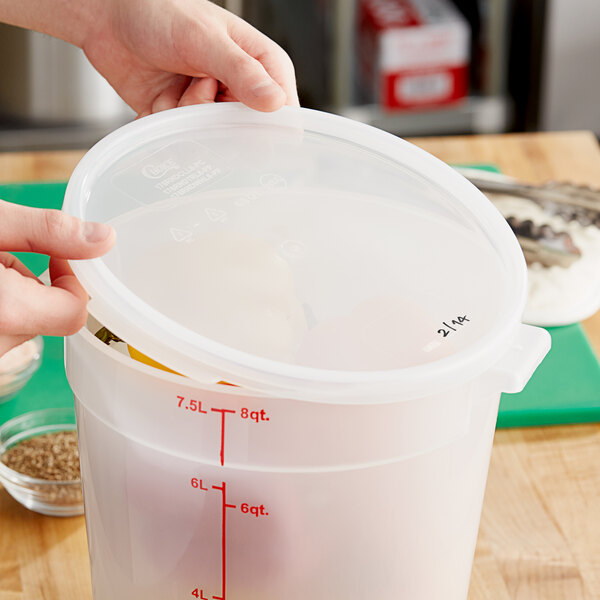 Designed specifically to work with a Choice 6 or 8 qt. round food storage container, use this lid to cover freshly chopped fruit salad, sliced vegetables, soup stock, or stew! Plus, it helps prevent outside contaminants from getting in. Whether you're a chef, caterer, or cafe owner, this 6 and 8 qt. food container lid is the best choice for your business.