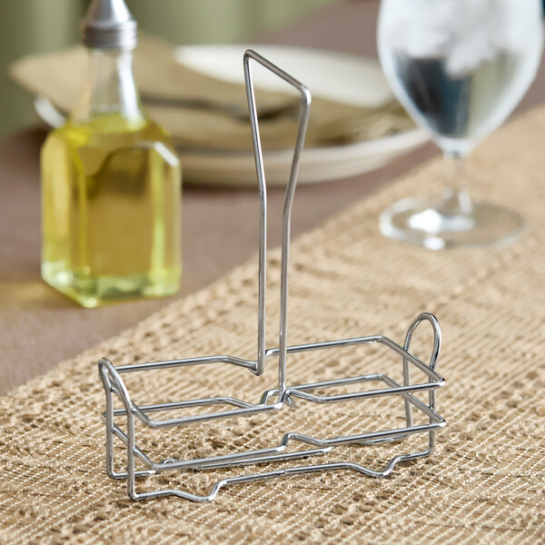 This handy rack keeps cruets stored safely out of the way yet available for customers to use during service. It holds a pair of 6 oz. cruets, making it perfect for presenting oil and vinegar to your guests.
