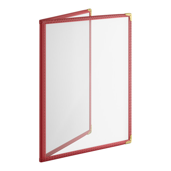 The double pocket construction provides four clear viewing surfaces for excellent menu visibility. This menu cover features a sophisticated burgundy vinyl trim border and bold brass corner protectors.