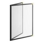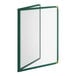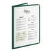 The double pocket construction provides four clear viewing surfaces for excellent menu visibility. This menu cover features a sophisticated green vinyl trim border and bold brass corner protectors.