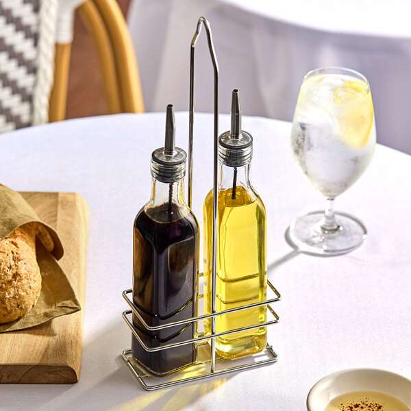 Two 8.5 oz. cruets fit into the rack, making them perfect for table service and front-of-house display options. The slim profiles are comfortable for guests to hold and use easily and their stylish and well-built glass construction will fit in with any dining establishment.