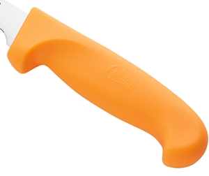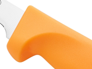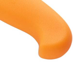 Designed to provide user control when deboning and portioning delicate meats, this knife features a narrow, semi-stiff blade and an ergonomic handle. This handle not only provides user comfort, it allows for a secure grip while navigating the blade around bone and cartilage. Plus, because it's neon orange, the handle is well-suited for pre-existing or newly established color-coding systems to prevent cross-contamination.