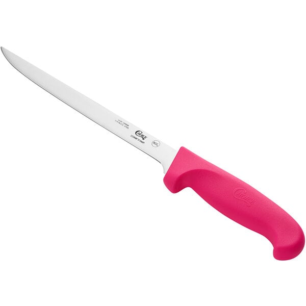 Designed to provide user control when deboning and portioning delicate meats, this knife features a narrow, semi-stiff blade and an ergonomic handle. This handle not only provides user comfort, it allows for a secure grip while navigating the blade around bone and cartilage. Plus, because it's neon pink, the handle is well-suited for pre-existing or newly established color-coding systems to prevent cross-contamination.