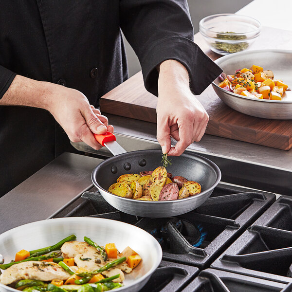 Ideal for making low acidic foods such as mushrooms, broccoli, and cauliflower, this item features gently sloped sides that are perfect for turning, flipping, and removing delicious vegetable medleys from your pan. Its aluminum construction is also built for dependable use yet provides your kitchen with a lightweight, economical option that won't break the budget. Plus, its PTFE non-stick coating offers advanced release properties for healthier cooking and easier cleanup, while its red silicone handle supplies a comfortable grip that's heat-resistant up to 450 degrees Fahrenheit!