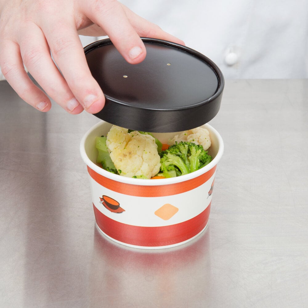 Engage your customers by offering to-go soups, stews, chilis, and more in this paper hot food cup. Featuring colorful imagery, this container serves as an advertisement for hungry guests passing through your convenience store, cafe, or grocery store. While the bright, colorful graphics are sure to draw attention, the sleek black lid provides a striking contrast to the container itself, too.