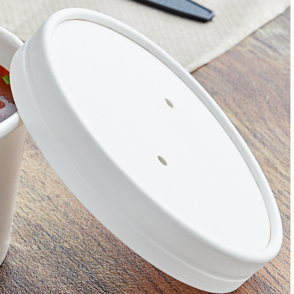 To avoid soggy product, this container and lid combo includes a vented paper lid that lets hot, moist air out, before it becomes stuck within the container. It is a crisp, white color, for a clean presentation every time, and it's made of the same double poly-coated paperboard as the container, so you know it's both durable and moisture-resistant.