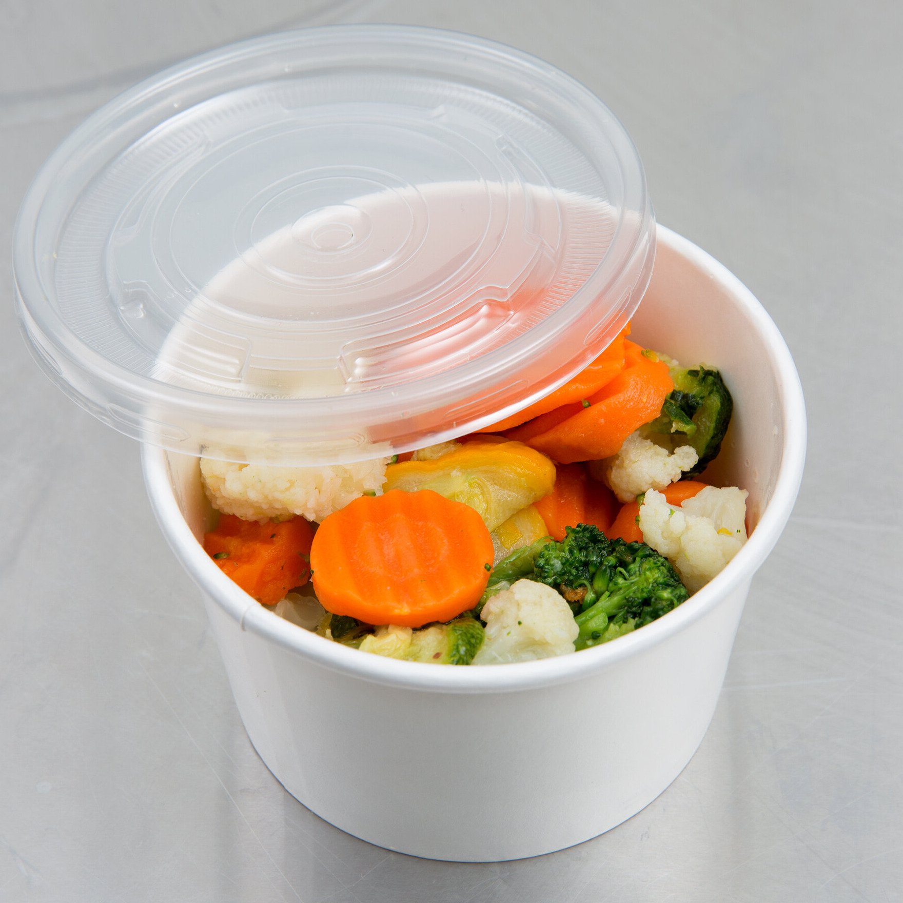 Made from double poly-coated paperboard, the cup is durable and moisture-resistant, allowing it to hold liquids and hearty foods without leakage. It ensures the combined rigidity and reliability you need in a take-out paper food cup and lid combo.