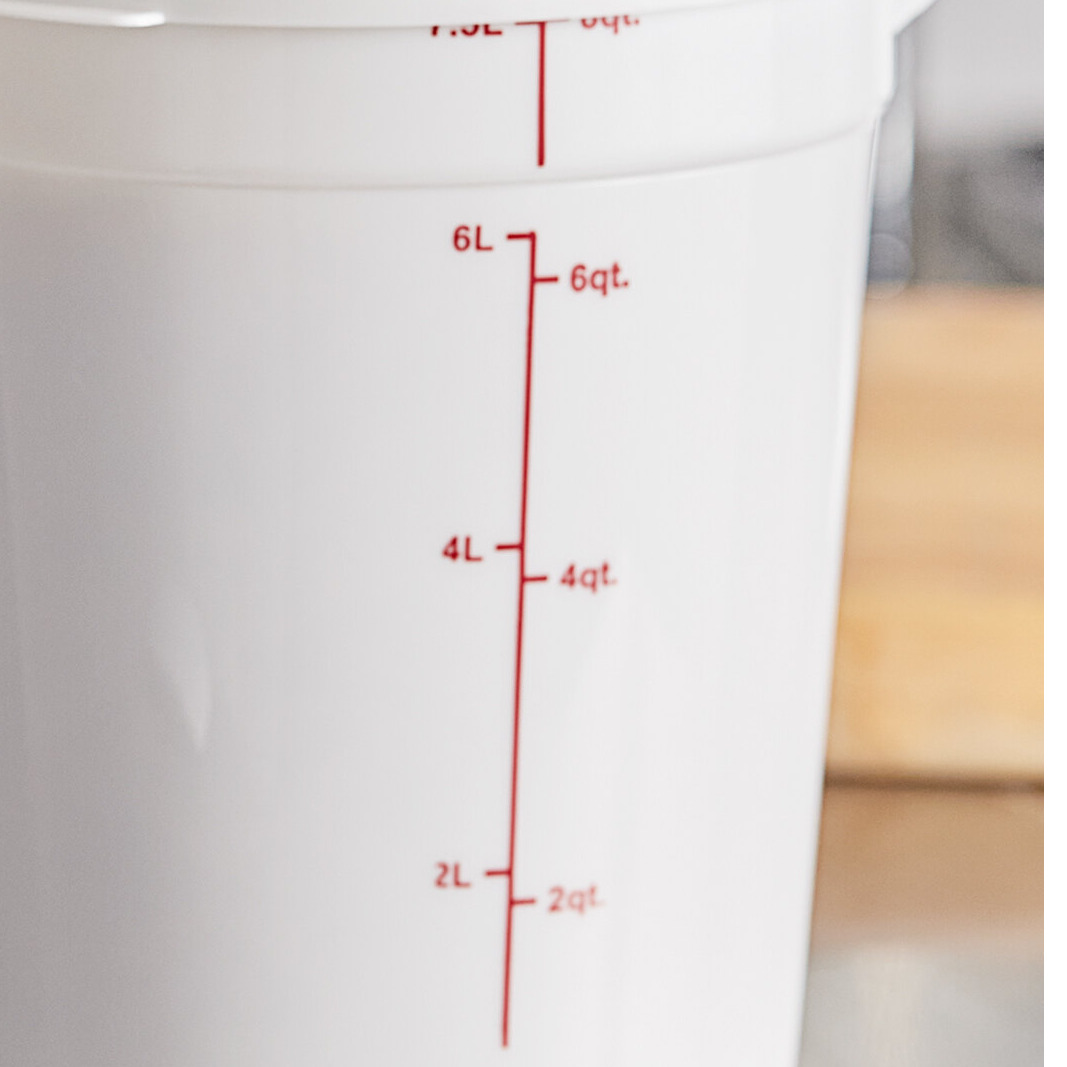 The white design of this food storage container allows for a clean look. Bold red graduations are printed on the side of the container in both quarts and liters for easy, immediate measuring, saving you time and effort during food preparation.