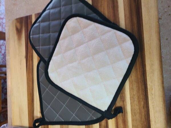 Our old potholders were getting worn out so we purchased this multipack to replace them all. As one of our volunteers lit a pot holder on fire, I tested the flame retardant nature of these and it did not light on fire. Also, I can hold a pan heated to 500 degrees for about 30 seconds with these pot holders.