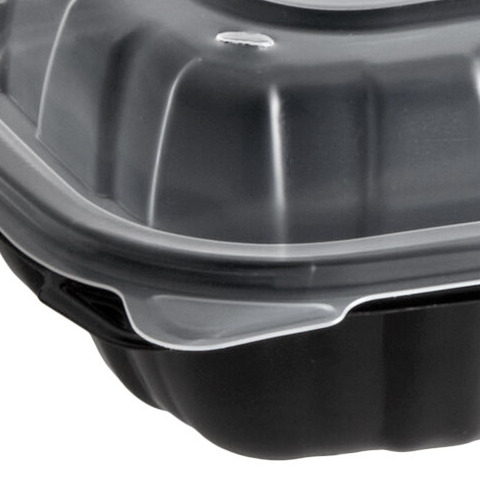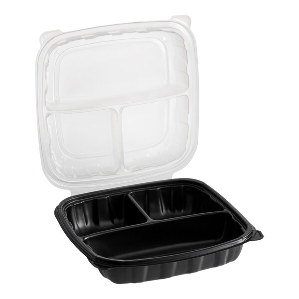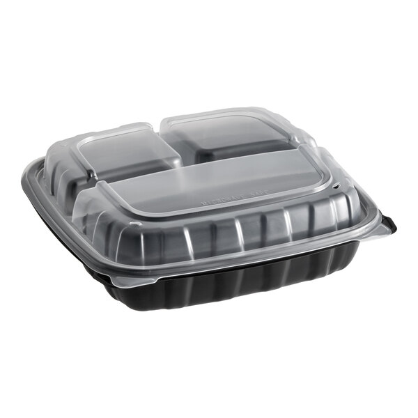 This plastic container is built with 3 compartments which makes it the ideal choice for keeping entrees, sides, and desserts separated.