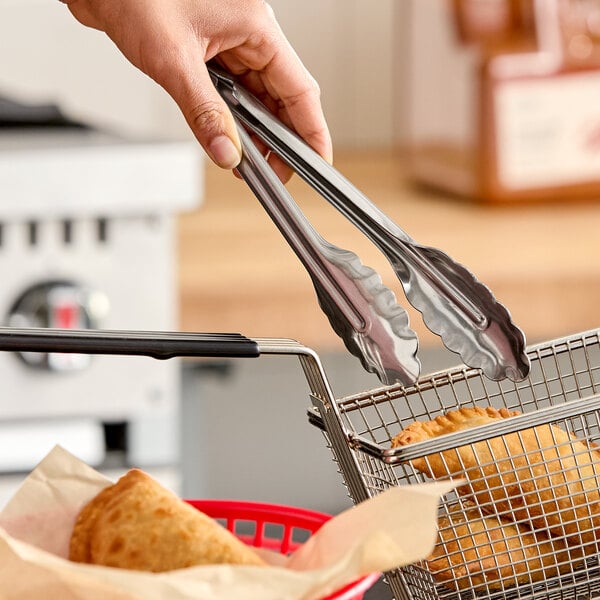 Satisfy your front- and back-of-house cooking and food-handling needs with these Choice 9 1/2" extra heavy-duty stainless steel utility tongs! Made of 18 gauge stainless steel, these utility tongs are the perfect way to efficiently handle and serve food in a fast-paced environment. Experience incredible ease of use while serving and cooking meats, salads, and other dishes as a result of the tong's concave utility end, which is equipped with a scalloped-edge design that grips food firmly and gently. While cooking, the extra-long handle will allow your employees to safely move, rotate, and serve hot foods with confidence. The two-piece stainless steel construction allows for quick and easy cleaning, and at the same time, presents a sleek and professional appearance, which complements both front- and back-of-house settings.