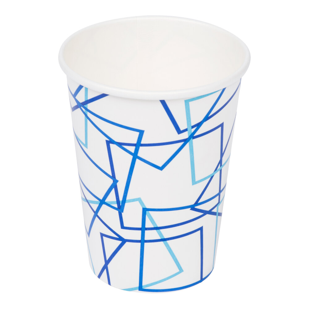 Draw customers in with the bold graphics found on this poly paper cold cup! Featuring a fun, blue cubed design in varying shades of blue against the stark white background, this cup is sure to become and eye-catching addition to your establishment.