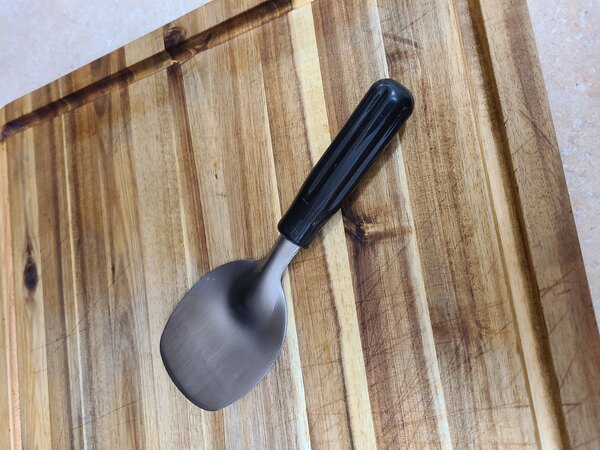 Super sleek heavy duty ice cream spade will fit all your possible applications! This will work extremely well in our workspace for a scoop instead of flimsy spoons.