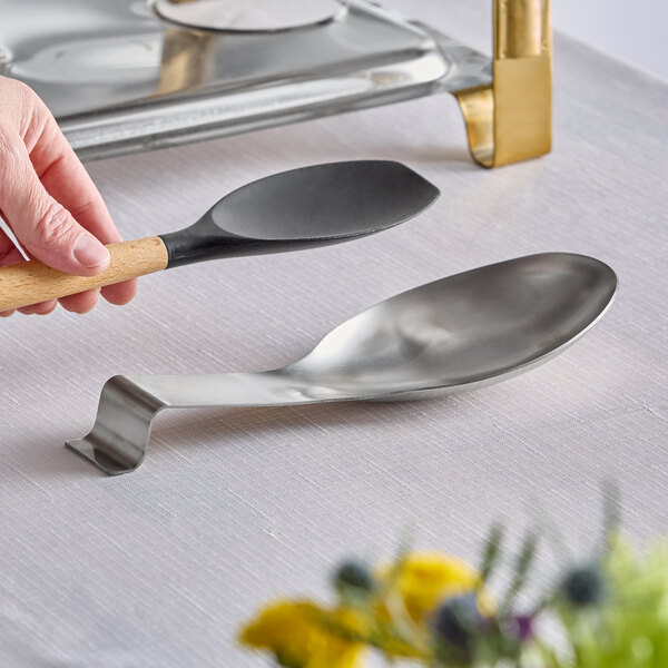 Designed for use with a variety of kitchen hand tools, this stainless steel spoon rest will help kitchen staff keep your counters, tables, stove tops, and buffet lines free of spills and messes to maintain an impeccable standard of presentation.