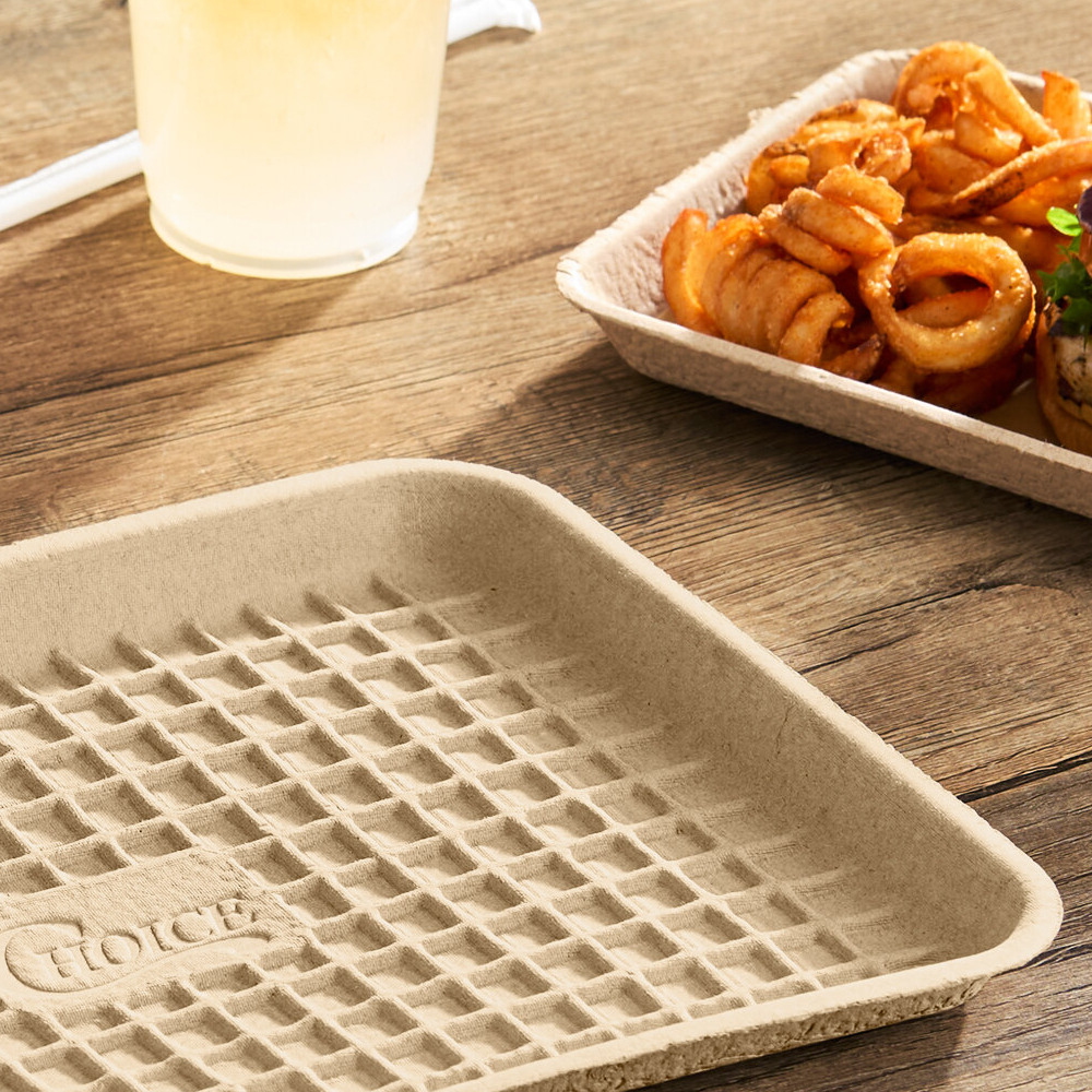 A great eco-friendly choice for your establishment, this tray is made from strong molded fiber and 100% recycled material. This makes it a great way to promote your green image to customers in comparison to foam or plastic alternatives! The strong design has a molded feel and texture that offers an easy grip. For optimal serving results, be sure to put down deli paper before placing food on the tray.