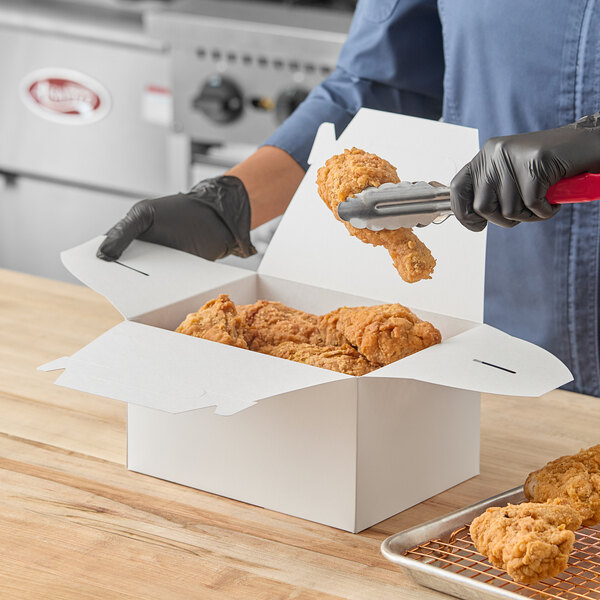 This handy box is ideal for offering small meals, fried chicken, and french fries to-go, making it perfect for restaurants, cafes, delis, and caterers. The clean, white exterior of this box allows for a variety of foods to be contained in style. Provide your customers with a hassle-free dining experience with this practical and functional take-out box!