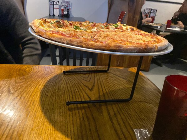These metal pizza stands are a great help in making more space for our guests at their tables. They are very sturdy and fit nicely on the table with the napkins and condiments.