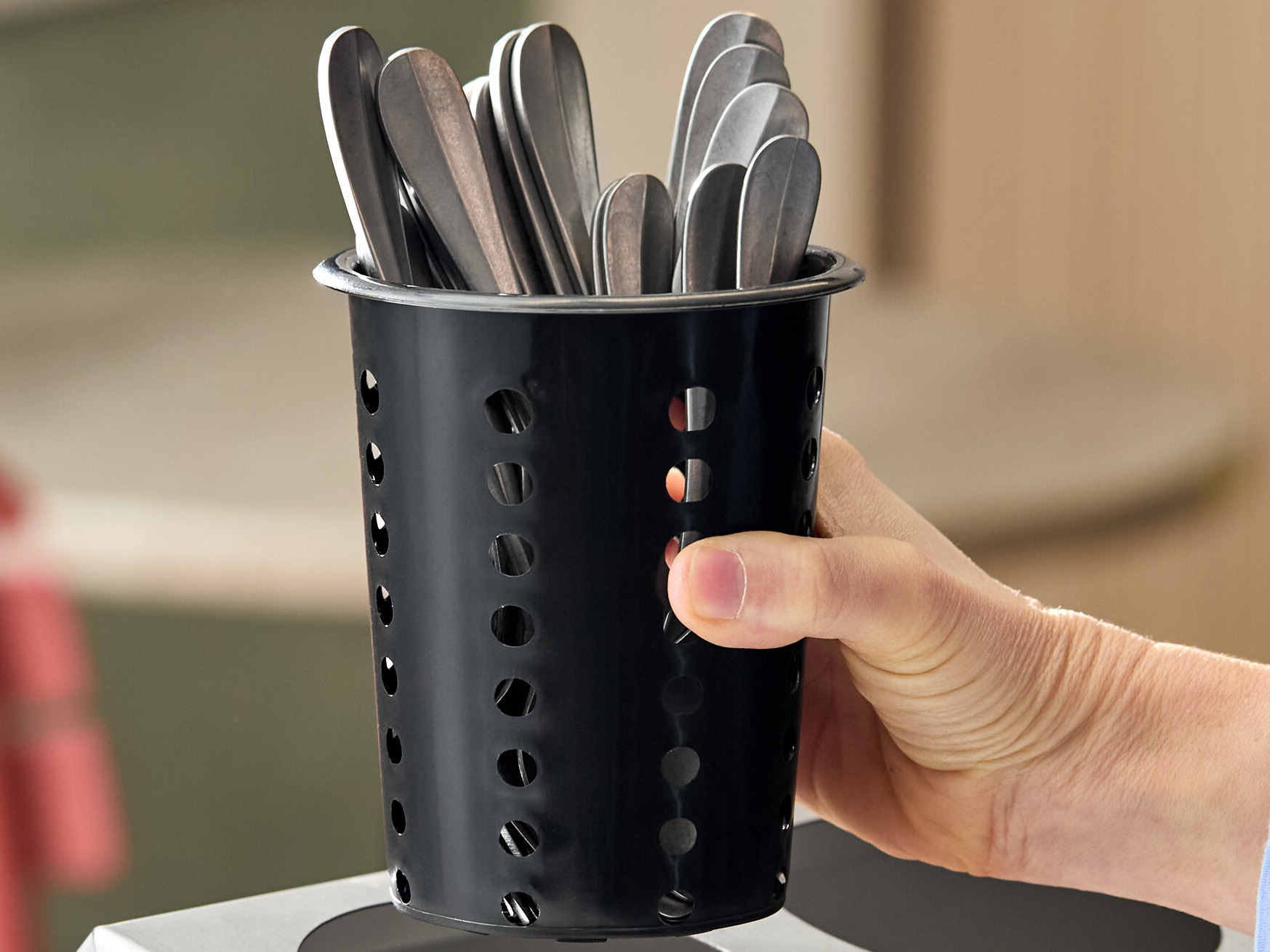 The cylinder's perforated design allows utensils to dry properly, preventing the accumulation of moisture that harbors bacteria. This cylinder's raised base also adds to its sanitary design. It elevates the utensils to prevent direct contact with countertops, so you can be sure your silverware stays clean from the dishwasher to the table.