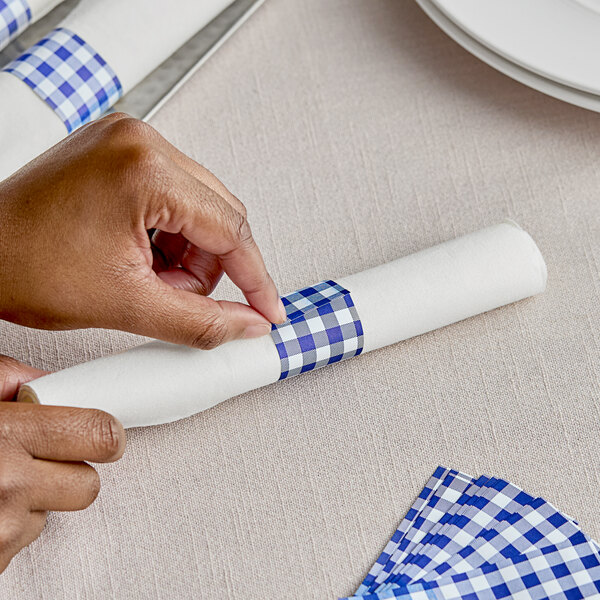 Enhance the presentation of your tabletops with this Choice blue gingham self-adhering paper napkin band!