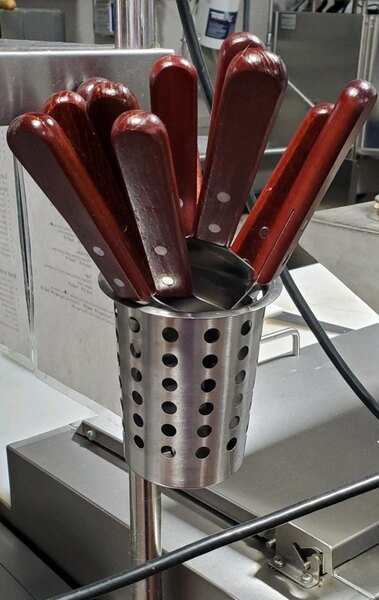 Great looking holder for the school serving line. Seems to be great quality and was paired with the Choice Black Perforated Plastic Flatware Holder Cylinder for a clean and professional look.