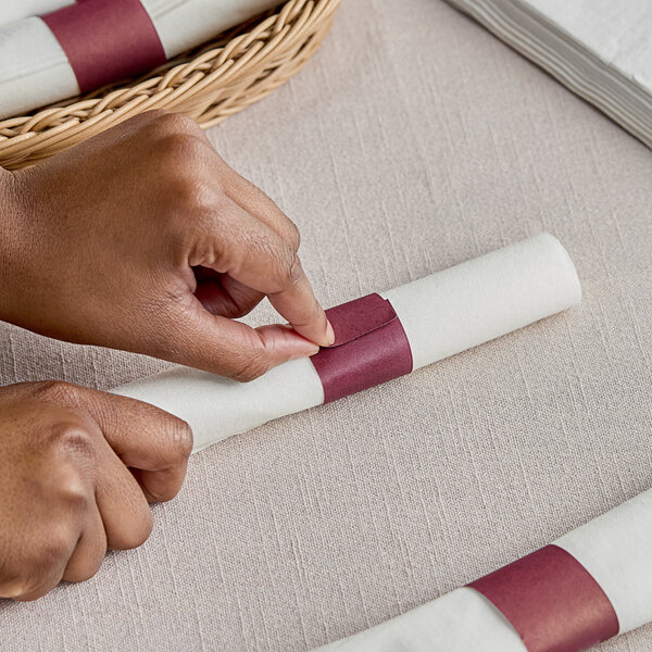 Featuring a rich burgundy red color, these napkin bands add an attractive touch to your dining area. Perfect for holding rolled napkins and flatware securely in place, these bands are a must-have for restaurants, cafes, and catered events. Ensure a seamless dining experience with these stylish and practical napkin bands!
