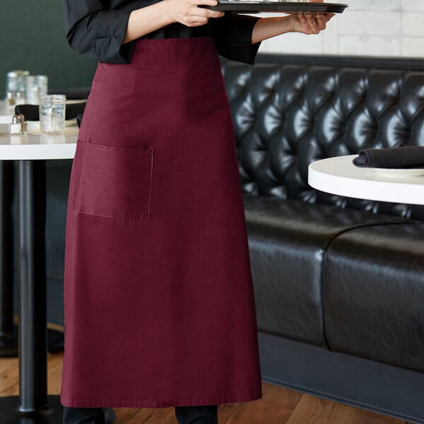 Both efficient and stylish, this Choice apron features long ties for an adjustable, superior fit. Plus, its burgundy color sets a professional tone for your catering event, wine tasting, or chic bistro. It adds a charming and elegant touch.