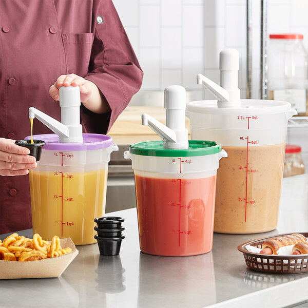 The pump, container, and lid are all constructed with polypropylene, making them durable, flexible, and odor- and stain-resistant. The 8 qt. container can hold the contents from two #10 cans or two 1 gallon containers, and handles on the container make transportation from a prep table to a walk-in refrigerator or storage shelf effortless.