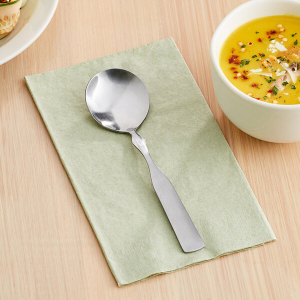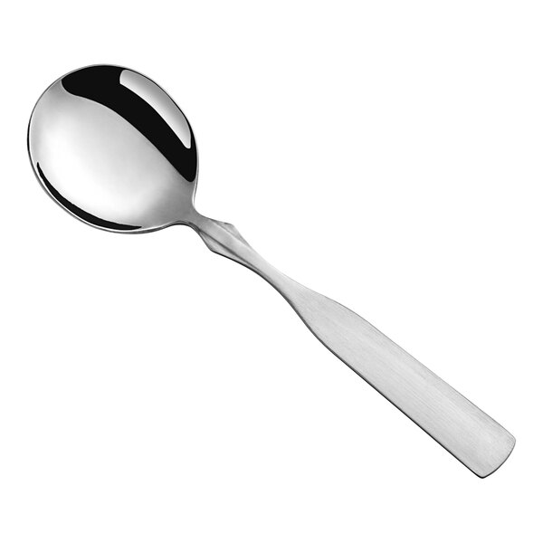 The handle of this bouillon spoon features a strong, square design with a gently curved panel for a shape that is simple but attractive. Its polished finish offers a clean appearance, and it is very much at home in your family restaurant, bar and grill, or cafe.