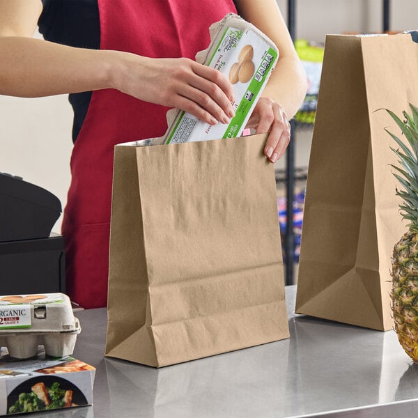 Made with 100% recycled, 2-ply unbleached kraft paper, this bag is an environmentally friendly option that aligns with your sustainability goals. It can even be recycled by your customers after use! Its unprinted kraft paper construction can be customized to your needs; stick labels, tags, UPC labels, or receipts with tape to this bag to promote branding and ensure careful tracking of order numbers and contents. Upgrade your delivery services with this Choice FiberCool metalized PET-insulated paper bag and provide your customers with a quality dining experience every time!