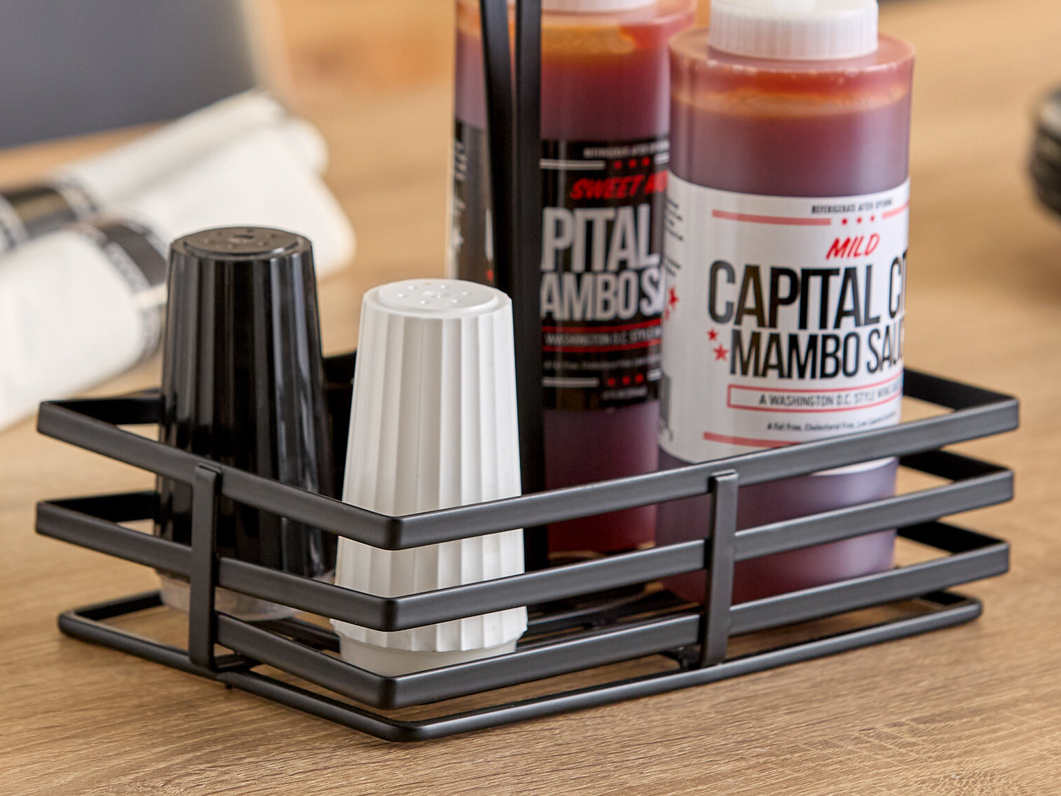 This choice brand rectangle wire condiment caddy is super nice I love that it’s rectangle it makes it nice and easy to fit on the tables that are up against the wall and it holds plenty of stuff