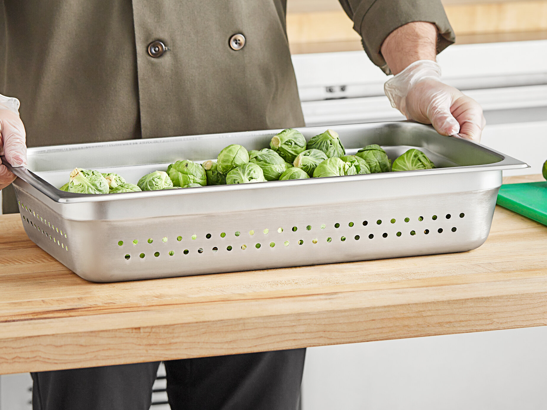 This steam table pan's perforated design allow food to drain quickly, making this pan perfect for steaming vegetables or draining meats.