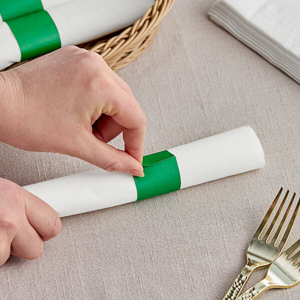 Featuring a vibrant green color, these napkin bands add an attractive touch to your dining area. Perfect for holding rolled napkins and flatware securely in place, these bands are a must-have for restaurants, cafes, and catered events. Ensure a seamless dining experience with these stylish and practical napkin bands!