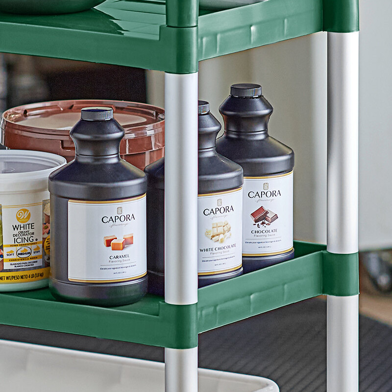 Whether you are bussing tables in a crowded restaurant or transporting supplies at a motel, this cart's three durable plastic shelves can hold a wide array of items, and a 13" clearance between each shelf allows for optimal storage. These 24" x 16" shelves provide room for an abundance of supplies, such as heavy bottles, cans, or bags of syrups, condiments, and cleaning products.